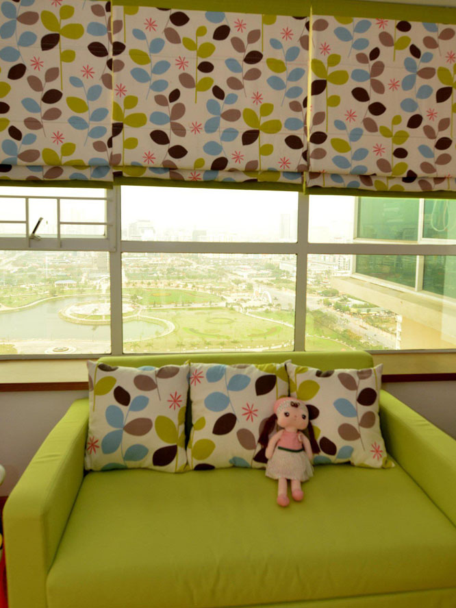 Còn với khu vực phòng chơi cho bé, sự lựa chọn trở nên rực rỡ vui tươi, đồng thời sẽ làm dịu cái nóng mùa hè. Bạn để ý sẽ thấy 1 bên cửa không cần làm cản sáng, ánh sáng xuyên qua rèm tạo nên 1 hình ảnh thật sinh động, phần cửa phía sau sofa bed màu xanh là những tấm rèm roman gọn gàng, và phía dưới là những chiếc gối tựa xinh.
